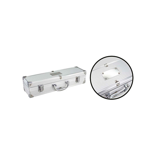 Deluxe BBQ set de asado en caja metálica. Incluye 3 herramientas de asado 100% acero inoxidable: cuchillo, tenedor y tenazas. Interior recubierto en tela ecológica negra. Manilla y cierres metálicos. Incluye placa metálica rectangular para grabar logo. Presentación bubble-bag + elegante caja de cartón laminado plateado.