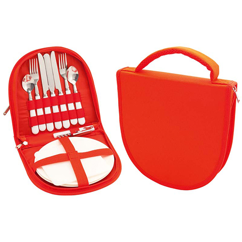 Set de Picnic para 2 personas en bolso raquelado con mango. Incluye set de cubiertos (cuchillos, tenedores y cucharas), 2 platos de melamina blanca, 1 tabla para cortar y 1 herramienta multiuso con destapador, descorchador y cortaplumas.