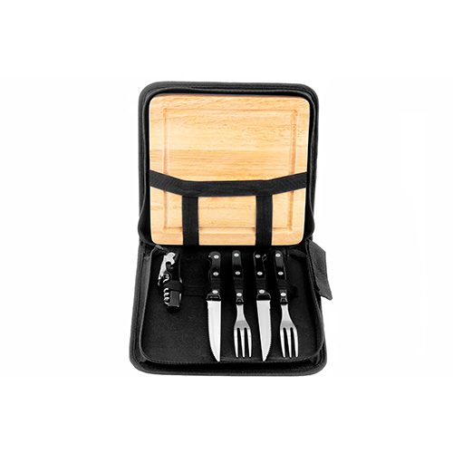 24,5 x 4,5 x 23 cm (cerrado). Acero inoxidable y Nylon. Contiene: 2 tablas de madera, 2 juegos de cubiertos (cuchillo y tenedor) y destapador. Estuche negro con cierre.